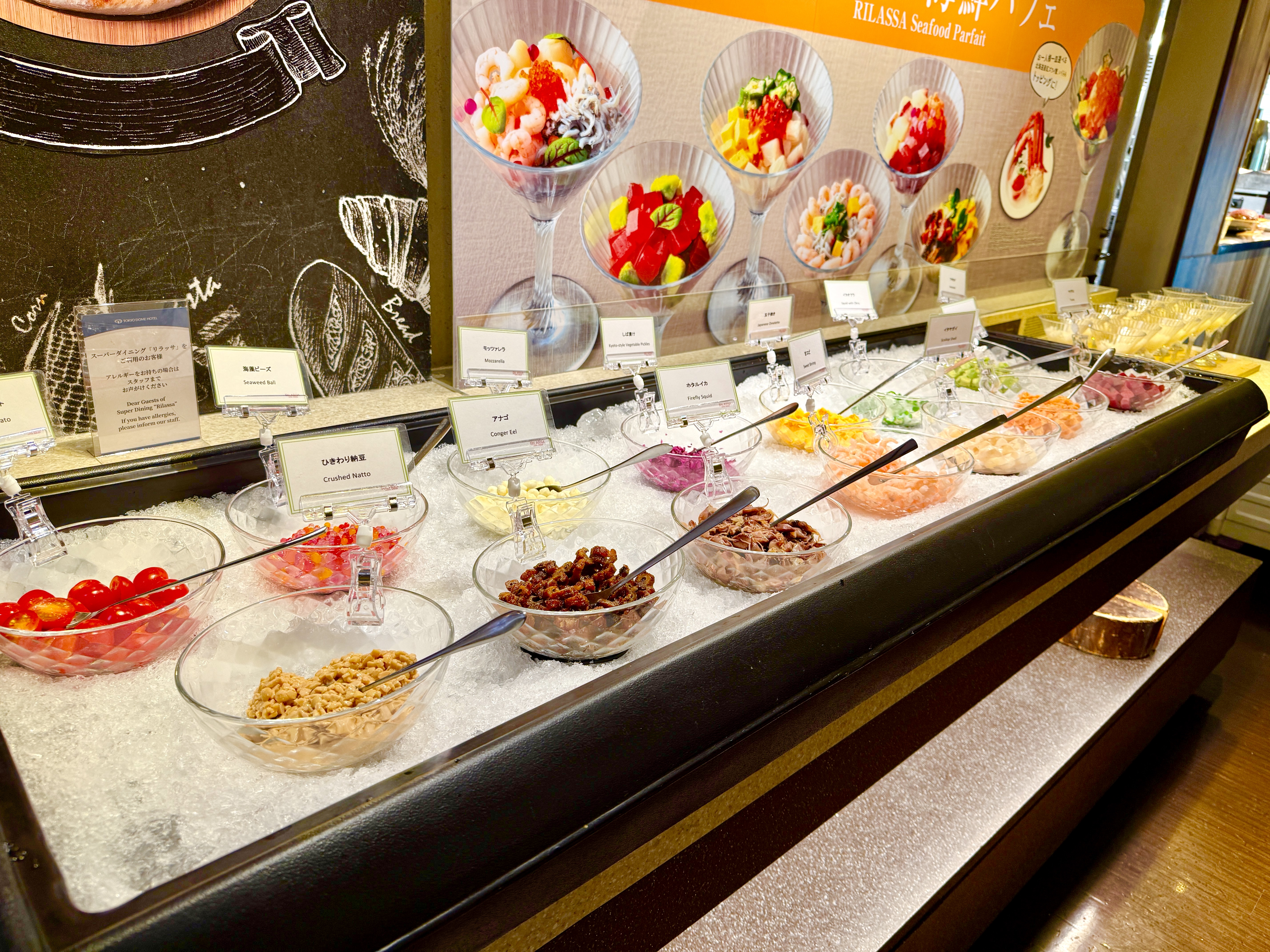 海の幸が好きな私がまず注目したのは、「リラッサ海鮮パフェ」(ディナー限定)。鮪、鮭、甘えび、いかオクラなど10種類を超える食材を自分でグラスに盛り付けて、オリジナルの海鮮パフェを作ることができます。