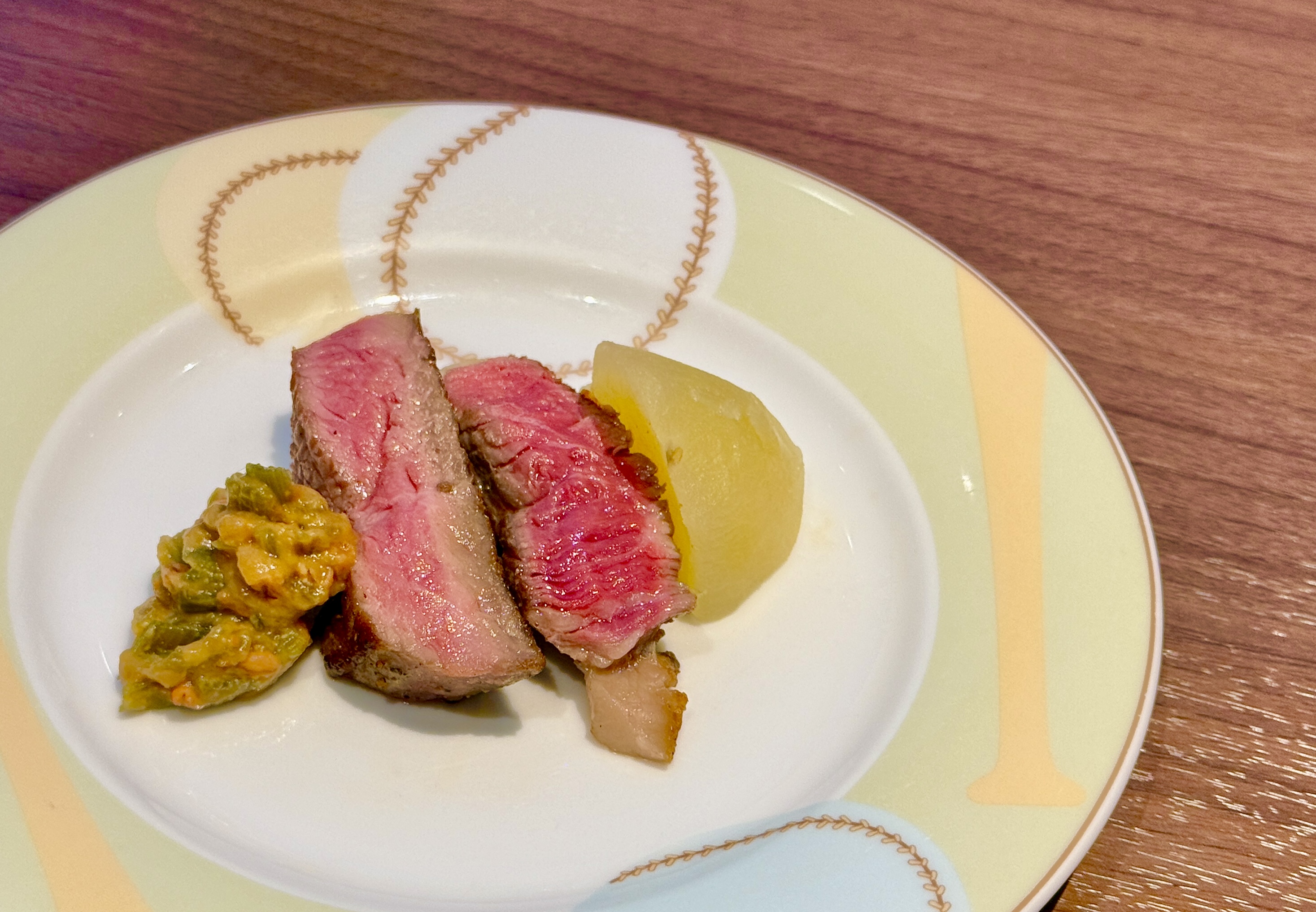 お肉派なら「牛ステーキと尾藤農産の雪室熟成じゃがいも『冬熟』足寄町産ラワンぶき入り味噌添え」で決まり! 厚みのある牛ステーキと甘いじゃがいものコンビは、言うまでもなく贅沢極まる逸品。