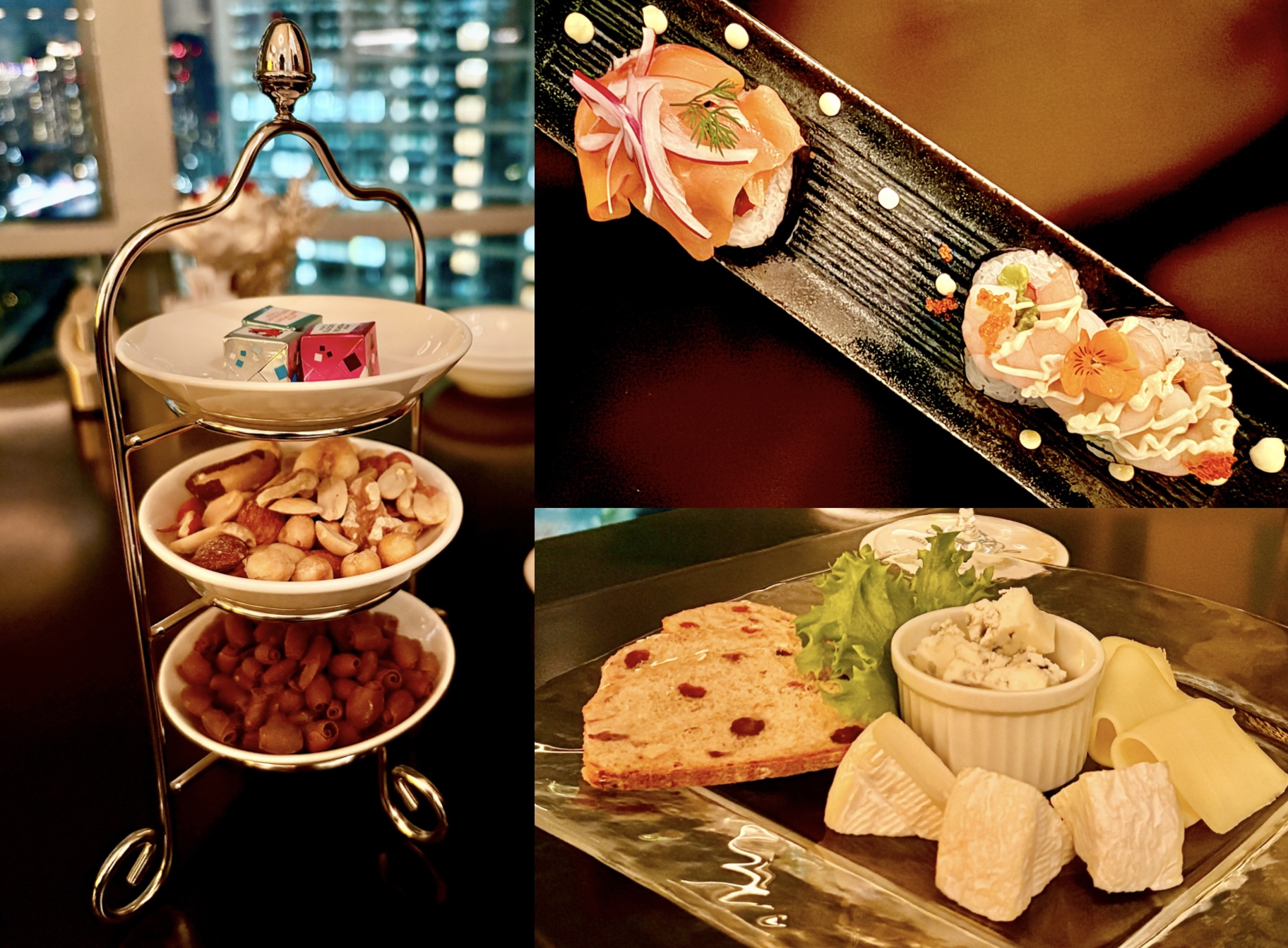 軽めにつまみたいなら「おつまみ3点盛り<ミックスナッツ・チョコレート・キューブチーズ>」や「チーズの盛り合わせ」もありますし、「SUSHIロール アボカド&サーモン・アボカド&シュリンプ」も映えと美味しさを兼ね備えています。