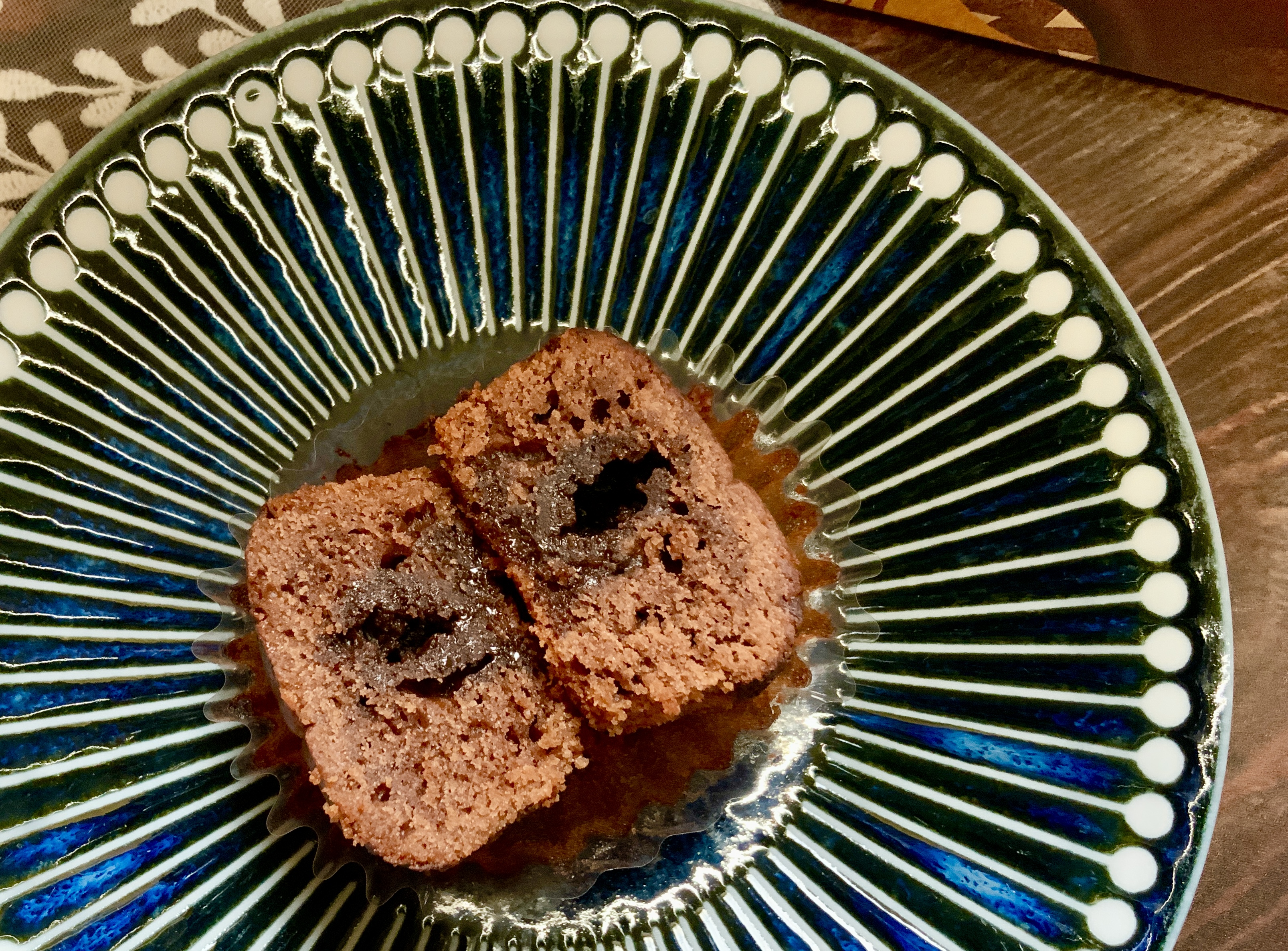 焼きあげた生地にあつあつのチョコレートソースを加えているそうで、断面には2層の濃淡ができていました。