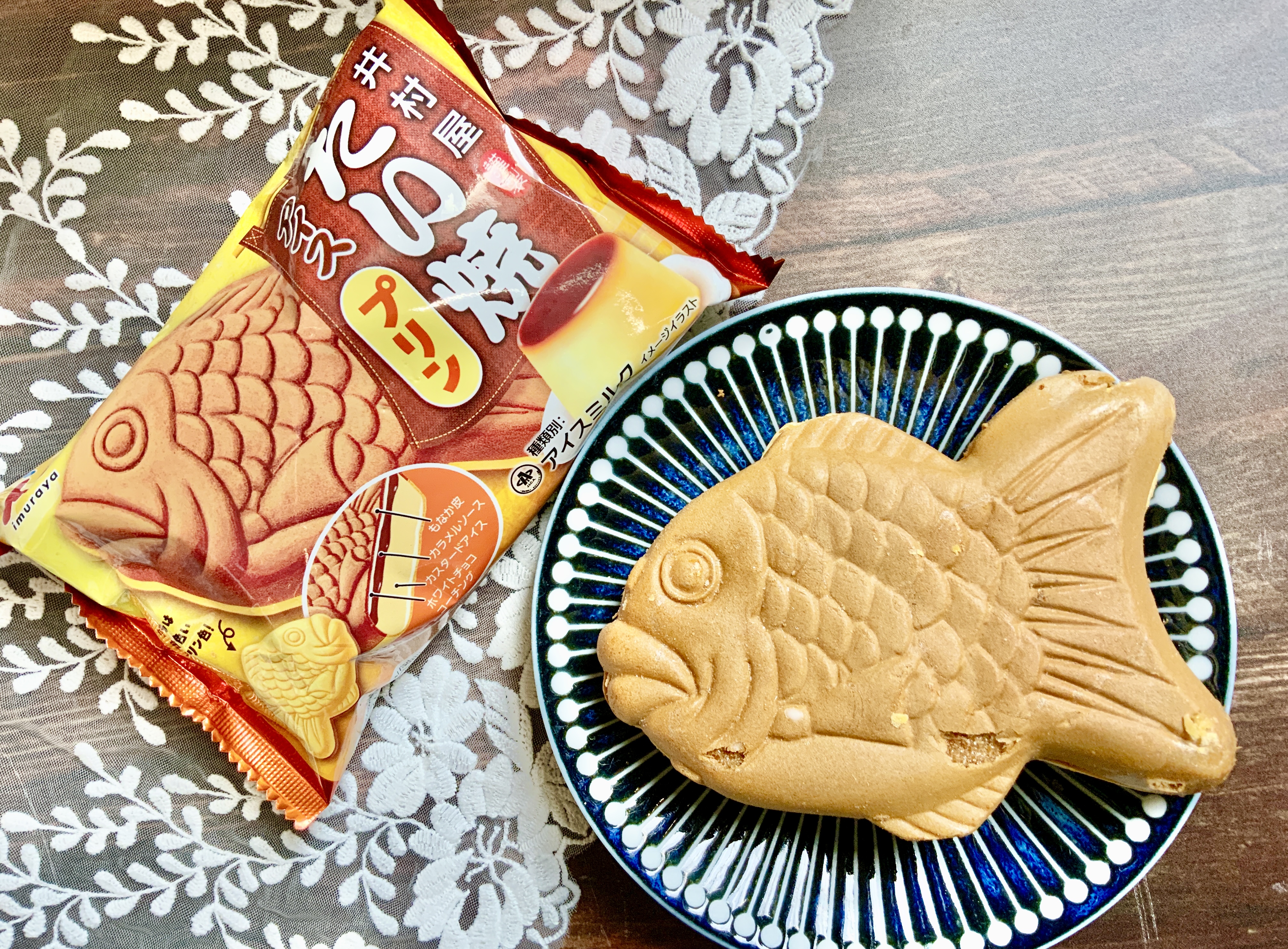 まずは新発売された「たい焼アイス プリン」からチェックしてみましょう。本物そっくりのたい焼き型もなかは定番と同じに見えます。