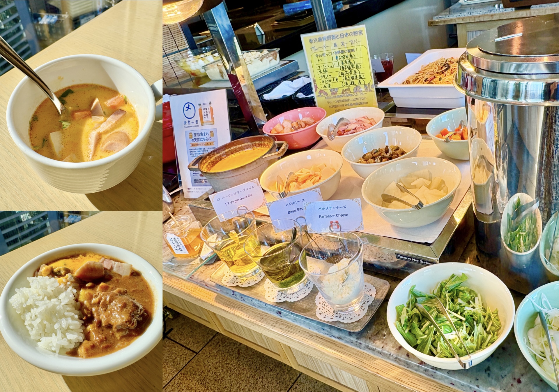 冬の東京農家野菜と日本各地の野菜などを自分好みにトッピングできる「クリームスープバー&牛すじ煮込みカレー」も心踊るメニューです。チーズフォンデュをかけたり、隠し味にはちみつを入れたりと自分だけのアレンジで楽しみましょう!