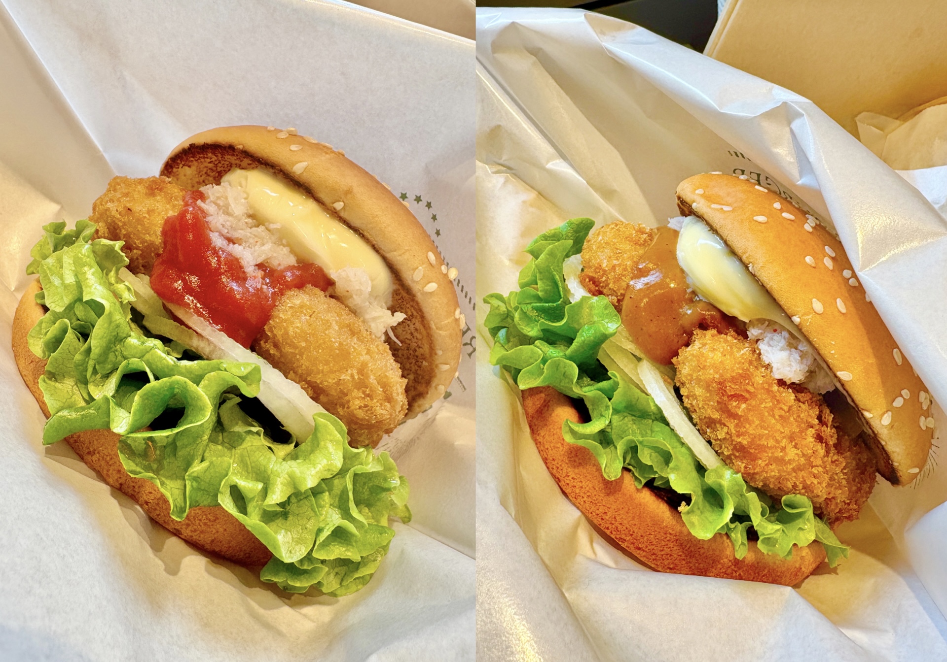 編集部で試食したのは、「オオズワイガニのクリームコロッケバーガー」。北海道で水揚げされたオオズワイガニの蟹身と北海道産生乳を使用したコクのあるベシャメル(ホワイト)ソース、北海道産小麦のパン粉で仕上げた濃厚クリームコロッケが贅沢に2個サンドされています。