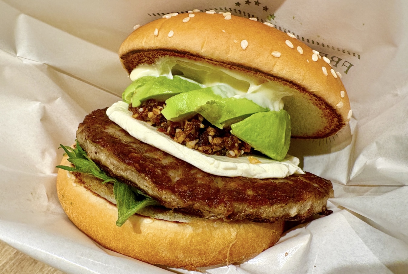 居酒屋などでも大人気のアボカド刺しを応用した、アボカドをわさびとフリーズドライのサクサク醤油で食べる和のハンバーガー。